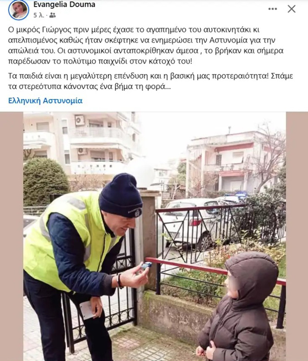 «Ο μικρός Γιώργος πριν μέρες έχασε το αγαπημένο του αυτοκινητάκι κι απελπισμένος καθώς ήταν σκέφτηκε να ενημερώσει την Αστυνομία για την απώλειά του. Οι αστυνομικοί ανταποκρίθηκαν άμεσα, το βρήκαν και σήμερα παρέδωσαν το πολύτιμο παιχνίδι στον κάτοχό του!