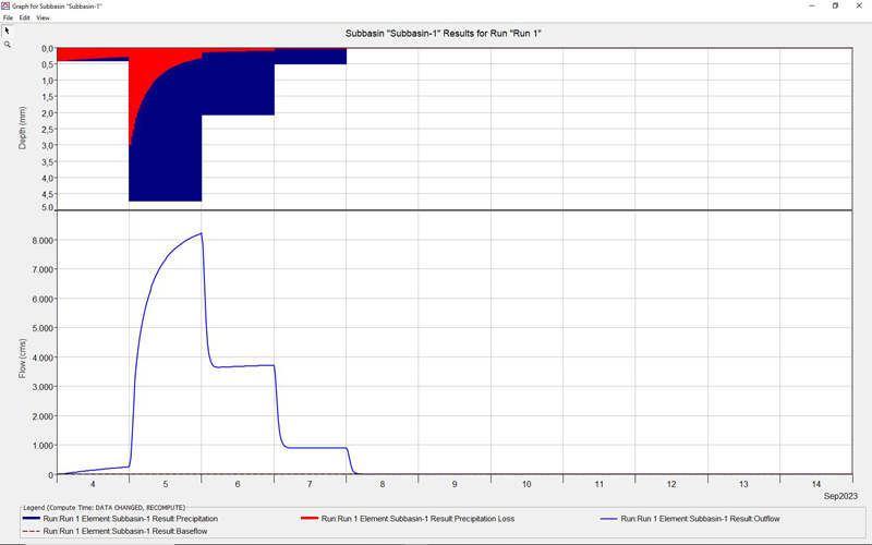 Επιπλέον, αρχικά, στην παρακάτω εικόνα απεικονίζεται το, “προσομοιωμένο ρεαλιστικό”, «διάγραμμα / ιστόγραμμα βροχόπτωσης / απορροής» του χρονικού διαστήματος, “04-07/09/2023” (“369,20 mm”), (το οποίο και θα «αποδώσει» την, “προσομοιωμένη ρεαλιστική”, παροχή αιχμής νερού και συγκεκριμένα «8.220,50 κυβικά μέτρα ανά δευτερόλεπτο» ή αλλιώς «8.220,50 m3/sec»), [το οποίο και «απέδωσε», λόγω ενός ακραίου μετεωρολογικού φαινομένου, με την κωδική ονομασία «Daniel», την, “προσομοιωμένη ρεαλιστική”, συνολική ποσότητα νερού, συγκεκριμένα, «1.013.344.000 κυβικά μέτρα (τόνους νερού)» ή αλλιώς «1.013.344.000 m3 (τόνους νερού)»], και το αντίστοιχο, “προσομοιωμένο ρεαλιστικό”, «υδρογράφημα απορροής πλημμύρας» που προκύπτει από το συγκεκριμένο, “προσομοιωμένο ρεαλιστικό”, επεισόδιο βροχόπτωσης, (λόγω του ακραίου μετεωρολογικού φαινομένου, με την αντιστοιχισμένη κωδική ονομασία «Daniel»), (η ανάλυση και οι υπολογισμοί έγιναν με το ελεύθερο στο διαδίκτυο λογισμικό «HEC-HMS» του «U.S.A. Army Corps of Engineers» δηλαδή του «Σώματος Μηχανικών του Στρατού των Η.Π.Α.») [1,2,4,5,6.1-6.3].