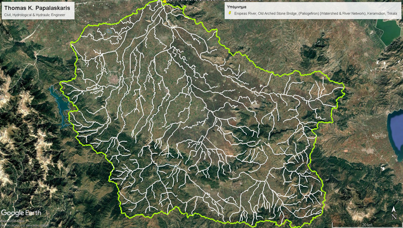 Εικόνα 3. Η απεικόνιση της λεκάνης απορροής [περίγραμμα με «ανοιχτή πράσινη» απόχρωση, που αντιστοιχεί έως την θέση του «Παλιογέφυρου (Τοξοτού) του Κεραμιδίου», στο ύψος του οικισμού “Κεραμίδι, (“Δήμου Φαρκαδόνας”), Π.Ε. (Νομού) Τρικάλων”»] και του αντίστοιχου, περιεχόμενου σε αυτήν, υδρογραφικού δικτύου (γραμμές με «λευκή» απόχρωση) του «Ποταμού Ενιπέα» επί του υπόβαθρου της διαδικτυακής πλατφόρμας «Google Earth» [1,2,4,7].