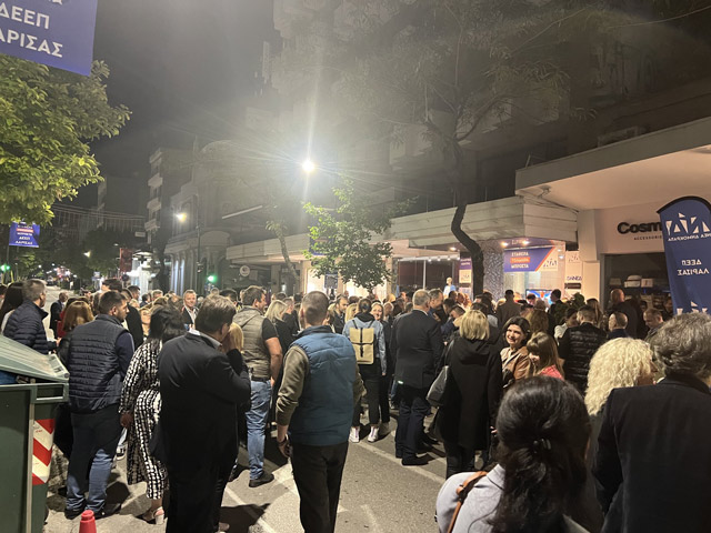 Οι Νεοδημοκράτες συγκεντρώθηκαν στο εκλογικό κέντρο της ΝΔ στο κέντρο της Λάρισας και ξεσήκωσαν την πόλη με κόρνες, πυροτεχνήματα και καπνογόνα.