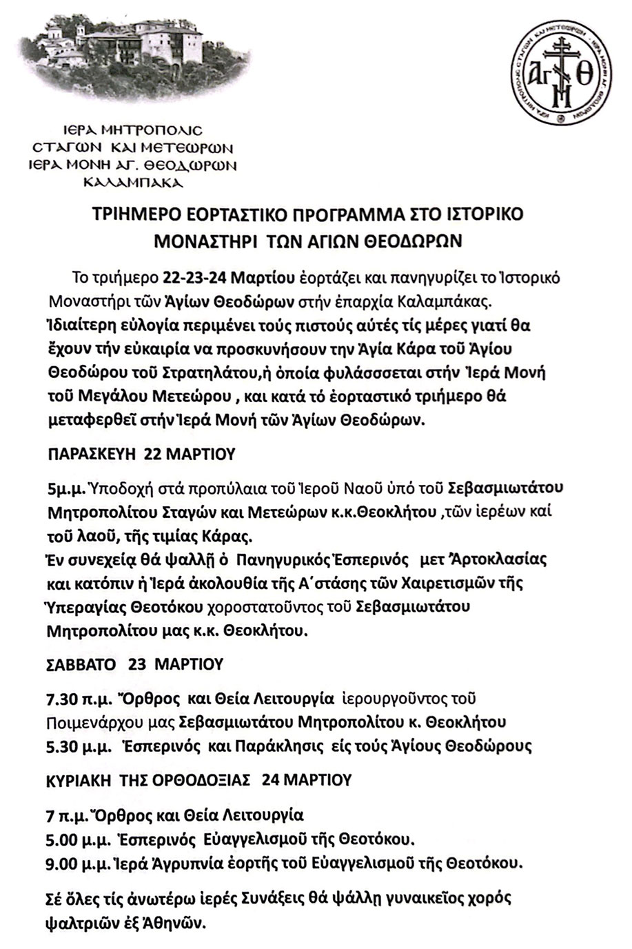 Το τριήμερο 22-23-24 Μαρτίου έορτάζει και πανηγυρίζει το Ιστορικό Μοναστήρι των Αγίων Θεοδώρων στήν επαρχία Καλαμπάκας.