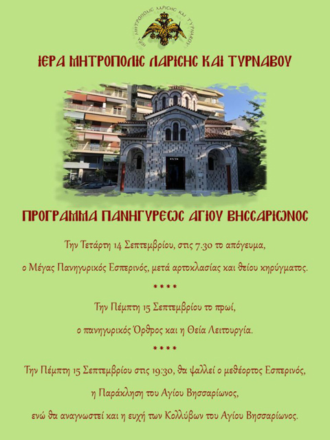 - Την Πέμπτη 15 Σεπτεμβρίου στις 19:30, θα ψαλλεί ο μεθέορτος Εσπερινός, η Παράκληση του Αγίου Βησσαρίωνος, ενώ θα αναγνωστεί και η ευχή των Κολλύβων του Αγίου Βησσαρίωνος.