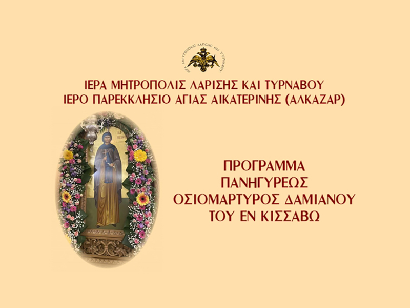 Την Παρασκευή 14 Φεβρουαρίου, εορτή του Οσιομάρτυρος Δαμιανού του εν Κισσάβω πανηγυρίζει το εν Λαρίση Μητροπολιτικό Παρεκκλήσιο της Αγίας Αικατερίνης στη συνοικία Αλκαζάρ, του οποίου ο υπόγειος χώρος θα αφιερωθεί στον Οσιομάρτυρα μετά το πέρας της ανεγέρσεως του υπέργειου ναού.
