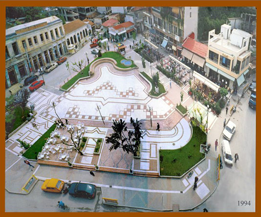 Ίσως η παραβίαση ορισμένων χρήσεων (π.χ. εξάπλωση των τραπεζοκαθισμάτων πέραν των προβλεπομένων γι αυτή τη χρήση εκτάσεων κ.α.), ίσως να αλλοιώνει σήμερα την γενική εικόνα της πλατείας. Μια προσεχτική, όμως, αντιπαράθεση των σχεδίων της μελέτης και της πραγματικότητας δείχνει, ότι δεν υπάρχει απολύτως καμία διαφοροποίηση της μελέτης στην πράξη. Γι αυτό οφείλω ευχαριστίες στην τότε Δημοτική Αρχή, η οποία δεν έκανε καμία επέμβαση στην εφαρμογή των σχεδίων, τα οποία εφαρμόστηκαν απολύτως, με προσωπική μου επίβλεψη των εργασιών.