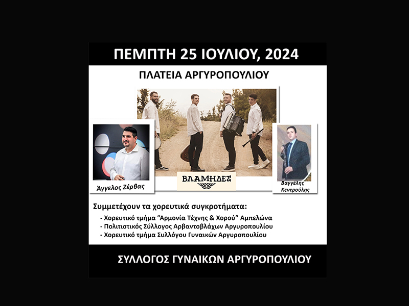 Ο Σύλλογος Γυναικών Αργυροπουλίου σας προσκαλεί σε ένα παραδοσιακό γλεντι την Πέμπτη 25 Ιουλίου, παραμονή της Αγίας Παρασκευής, στην πλατεία του χωριού.