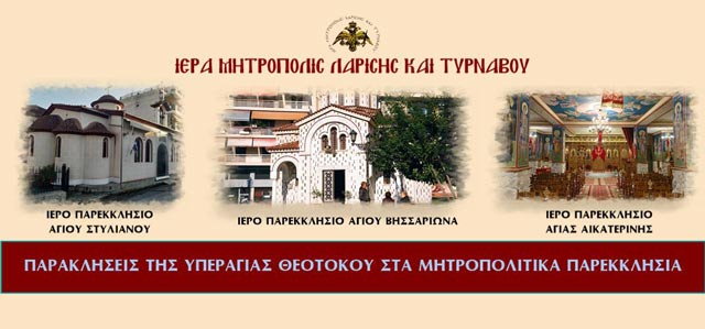 Από την Ιερά Μητρόπολη Λαρίσης και Τυρνάβου ανακοινώνεται ότι καθ’ όλη τη διάρκεια του Δεκαπενταυγούστου και τις ημέρες που η Αγία μας Εκκλησία έχει ορίσει να τελούνται Ιερές Παρακλήσεις προς τιμήν της Υπεραγίας Θεοτόκου, θα τελείται στα Ιερά Μητροπολιτικά Παρεκκλήσια η Παράκληση προς την Παναγία μας ως εξής: