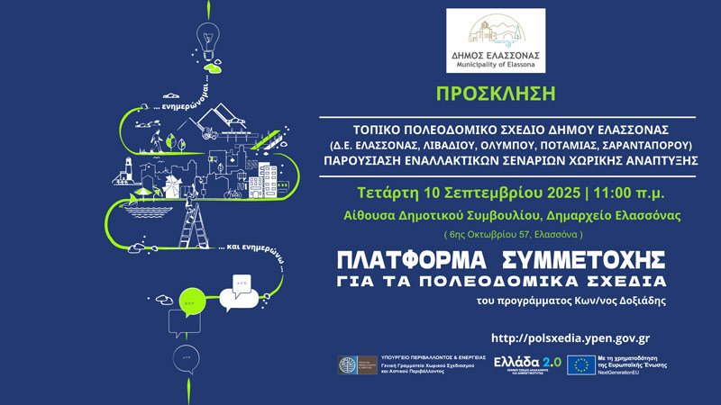 Ο Δήμος Ελασσόνας ενημερώνει ότι την Τετάρτη 10 Σεπτεμβρίου 2025, στις 11:00 στην αίθουσα του Δημοτικού Συμβουλίου στο Δημαρχείο Ελασσόνας, θα πραγματοποιηθεί η παρουσίαση των Εναλλακτικών Αναπτυξιακών Σεναρίων Χωρικής Οργάνωσης στο πλαίσιο του 1ου Σταδίου της Α΄ Φάσης της μελέτης του Τοπικού Πολεοδομικού Σχεδίου (Τ.Π.Σ.) για τις Δημοτικές Ενότητες Ελασσόνας, Λιβαδίου, Ολύμπου, Ποταμιάς και Σαρανταπόρου.