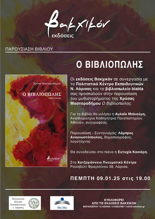 Το Πολιτιστικό Κέντρο Εκπαιδευτικών νομού Λάρισας – ΠΟΚΕΛ σε συνεργασία με το βιβλιοπωλείο «bla bla» και τις εκδόσεις «Βακχικόν» σας προσκαλούν στην παρουσίαση του νέου μυθιστορήματος της εκπαιδευτικού Χρύσας Μαστοροδήμου: «Ο βιβλιοπώλης», την Πέμπτη, 9 Ιανουαρίου 2025, στις 7:00 μ.μ., στο Χατζηγιάννειο Πνευματικό Κέντρο Λάρισας με ελεύθερη είσοδο (παραχώρηση χώρου Αντιδημαρχία Πολιτισμού του Δήμου Λαρισαίων).