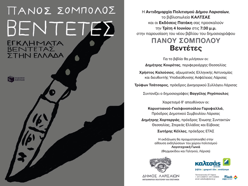 Το νέο βιβλίο του δημοσιογράφου Πάνου Σόμπολου ‘’ Βεντέτες ‘’, παρουσιάζουν η Αντιδημαρχία Πολιτισμού Δήμου Λαρισαίων , το βιβλιοπωλείο Καλτσάς και οι εκδόσεις Πατάκη, την Τρίτη 4 Ιουνίου στις 19.30 στην αίθουσα εκδηλώσεων του χώρου πολιτισμού Λογοτεχνική Γωνιά (Φαρμακίδου και Γαληνού , Λάρισα )