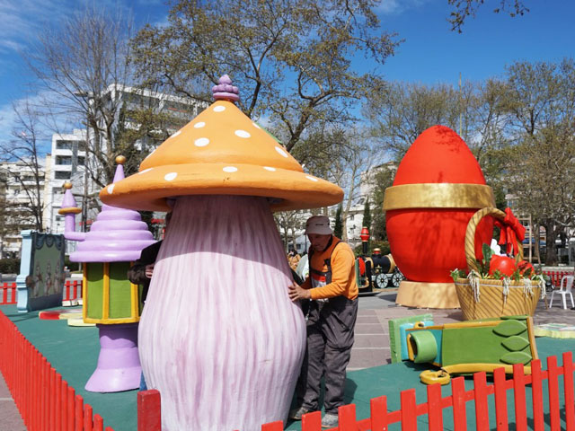 Ένα μικρό πασχαλινό χωριό, με εποχικές κατασκευές και σκηνικά, ετοιμάζεται στην Κεντρική Πλατεία της Λάρισας για να προετοιμάσει το κλίμα ενόψει των εορτών του Πάσχα.