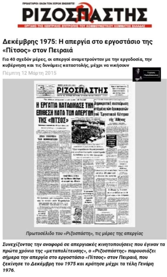 α) Εργαζόμενοι ( ; ) της Pitsos ποδοπατούν τις αφίσες της εταιρίας κατά τη διάρκεια απεργίας την δεκαετία του ’70. Ειδικά το Δεκέμβριο του 1975 η απεργία κράτησε 40 μέρες και οδήγησε στην πτώχευση της εταιρίας.