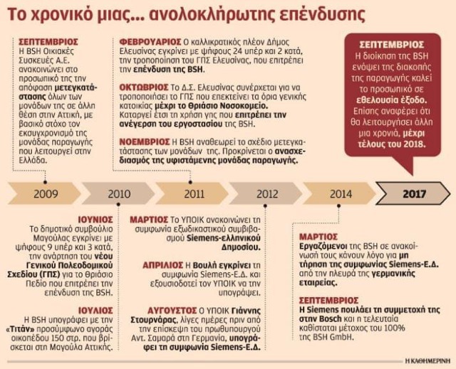 β) Το χρονικό μιας επένδυσης που δεν έγινε ποτέ. Το 2008 η Bosch Siemens ανακοινώνει την κατασκευή νέου εργοστασίου στην Ελλάδα, μία επένδυση που πέρα από χρήμα στα κρατικά ταμεία θα έφερνε και 600 νέες θέσεις εργασίας. Την επένδυση την πολέμησε από την πρώτη στιγμή ο Δήμος Ελευσίνας. Η επίσημη ιστοσελίδα του Δήμου Ελευσίνας στις 26 Οκτωβρίου 2011 αναφέρει: «Πρέπει να αποτρέψουμε το κοινωνικό και περιβαλλοντικό έγκλημα που σχεδιάζουν να υλοποιήσουν με τη διαδικασία fast track. Με συντονισμένες ενέργειες του λαού της περιοχής και της Τοπικής Αυτοδιοίκησης μπορούμε να πετύχουμε τη ματαίωσή του»
