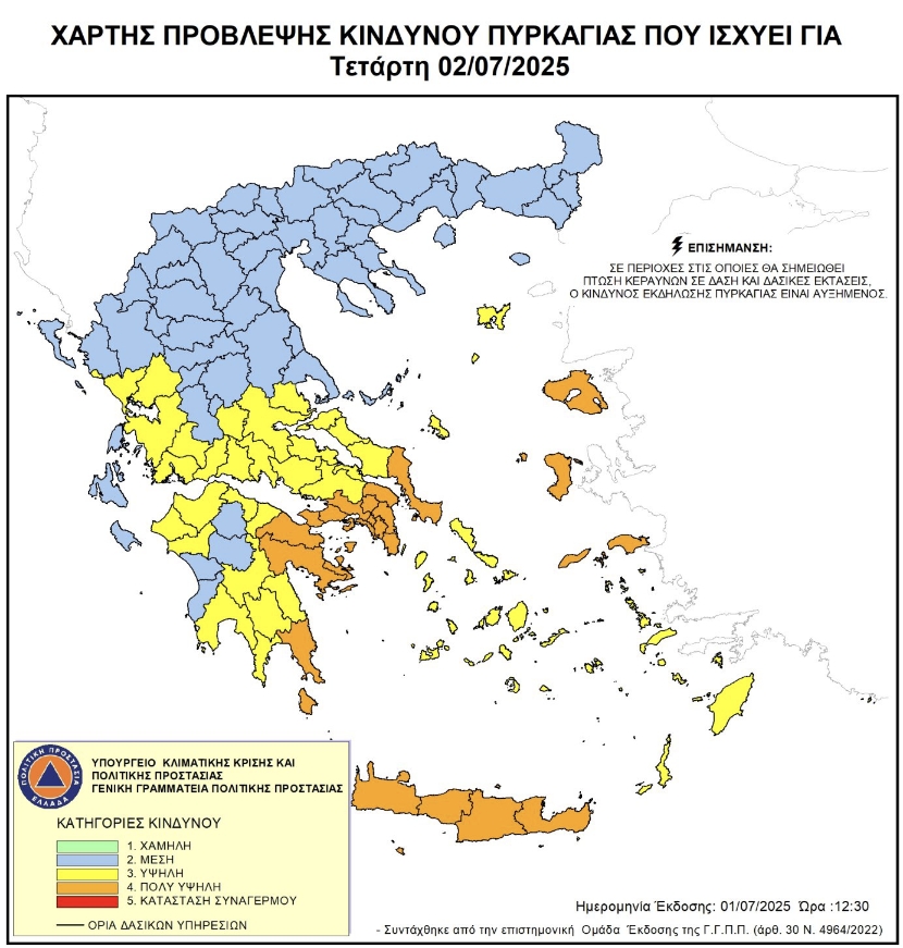 Η Περιφέρεια Θεσσαλίας ενημερώνει ότι σύμφωνα με τον Ημερήσιο Χάρτη Πρόβλεψης Κινδύνου Πυρκαγιάς της Γενικής Γραμματείας Πολιτικής Προστασίας, για την Τετάρτη 02 Ιουλίου 2025, προβλέπεται Κατηγορία Κινδύνου 3 (υψηλή) για περιοχές της Π.Ε. Μαγνησίας.