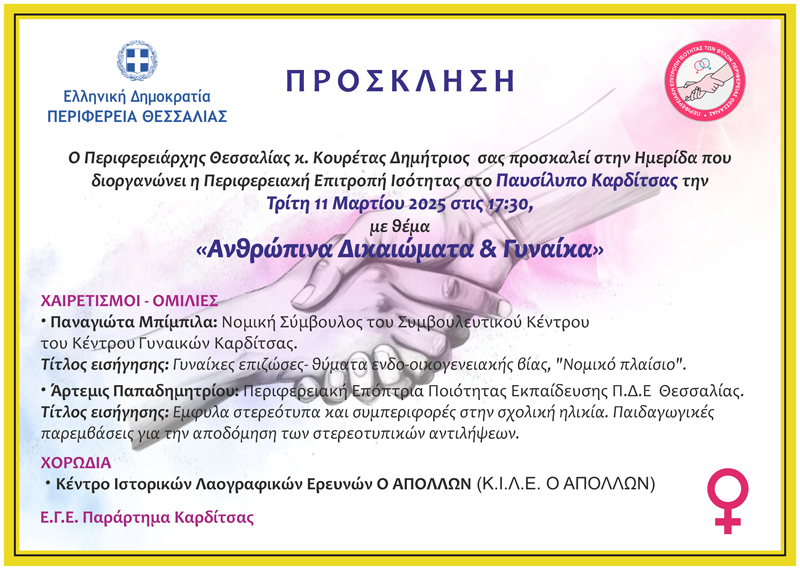 Περιφέρεια Θεσσαλίας: Ημερίδα με θέμα «Ανθρώπινα Δικαιώματα & Γυναίκα» στην Καρδίτσα