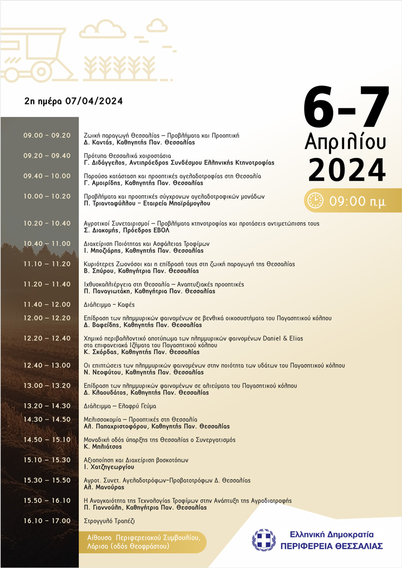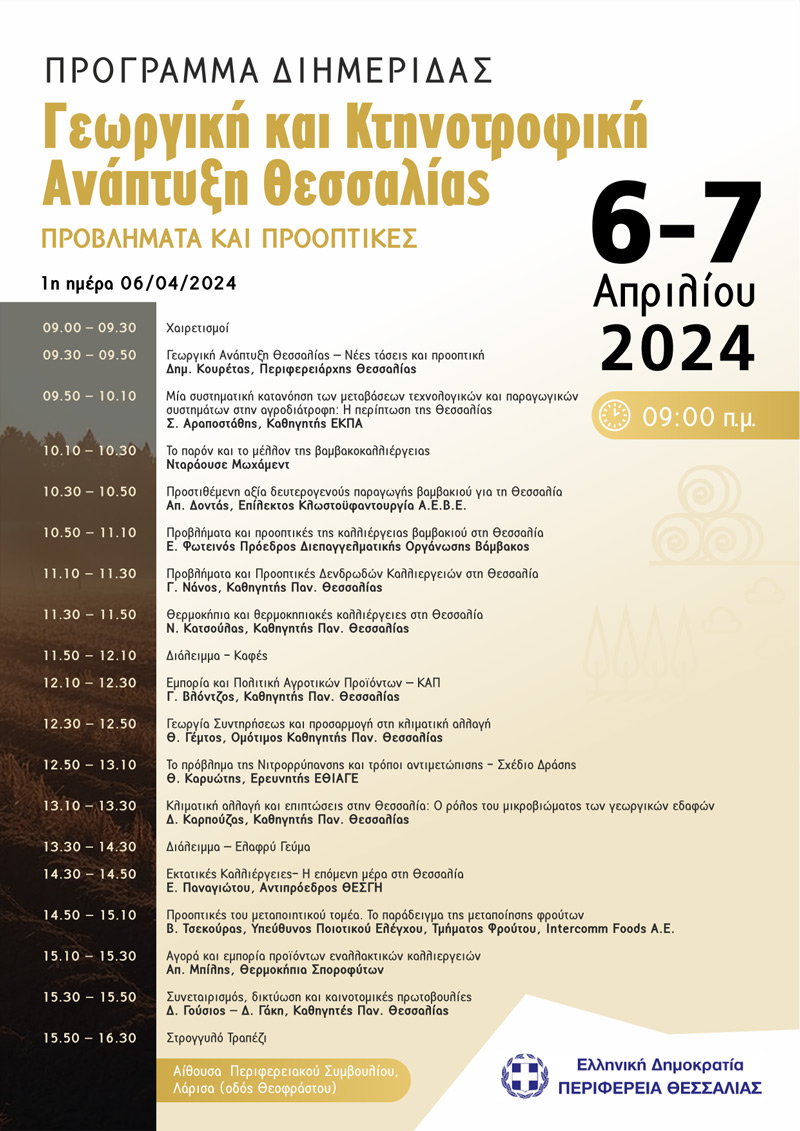 Η Περιφέρεια Θεσσαλίας και το Περιφερειακό Συμβούλιο Έρευνας και Καινοτομίας διοργανώνουν διημερίδα στη αίθουσα του Περιφερειακού Συμβουλίου (Καλλισθένους & Θεοφράστου) με θέμα: ΓΕΩΡΓΙΚΗ ΚΑΙ ΚΤΗΝΟΤΡΟΦΙΚΗ ΑΝΑΠΤΥΞΗ ΘΕΣΣΑΛΙΑΣ – ΠΡΟΒΛΗΜΑΤΑ ΚΑΙ ΠΡΟΟΠΤΙΚΕΣ στις 6 και 7 Απριλίου 2024.