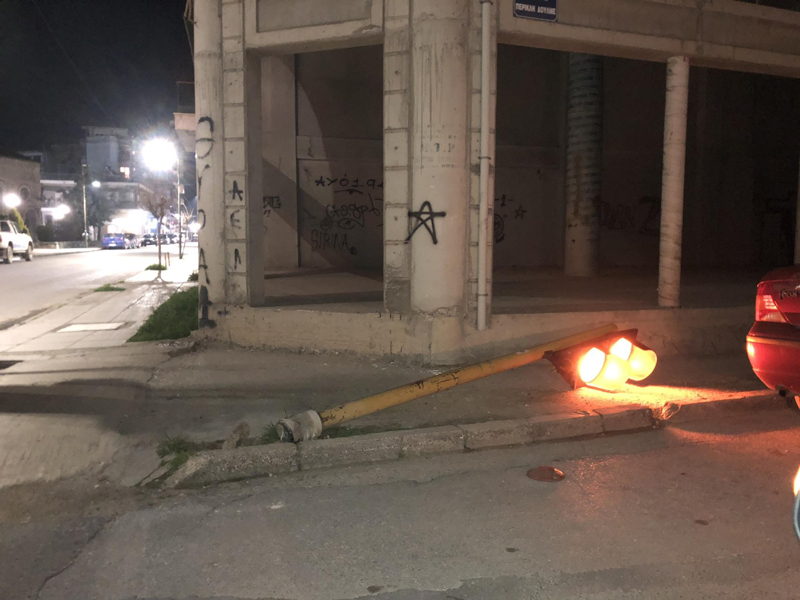 Στην διασταύρωση της Λεωφόρου Ηρώων Πολυτεχείου με Περικλή Δουλμέ το φανάρι έπεσε μετά από κάποια σύγκρουση από διερχόμενο όχημα.