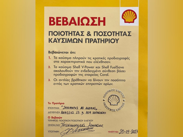 Για εκείνους η ποιότητα και η ποσότητα έχει σημασία αφού ολοκληρώσανε με επιτυχία τον αυστηρότατο έλεγχο ποιότητας και ποσότητας από εγκεκριμένο χημείο της Shell και πιστοποιήθηκε πως το πρατήριο Αθανάσιος, Νικήτας & Ανδρέας Σακελλάρης πληροί στο ακέραιο όλες τις προδιαγραφές που απαιτούνται για την καλύτερη λειτουργία του οχήματος σας!!
