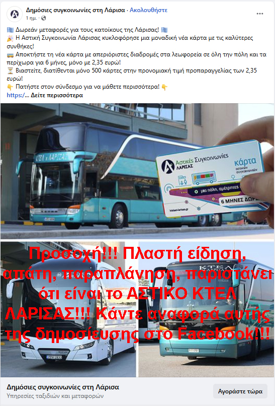 “Εφιστούμε την προσοχή του επιβατικού κοινού σε πλαστή σελίδα με τίτλο (Δημόσιες συγκοινωνίες στη Λάρισα) που έχει δημιουργηθεί στο Facebook και προσπαθεί να εξαπατήσει το επιβατικό κοινό σχετικά με δημοσίευμα που αναφέρει ότι διατίθενται 500 κάρτες απεριορίστων διαδρομών με ισχύ για 6 μήνες και με κόστος 2,35€ η κάθε μία.