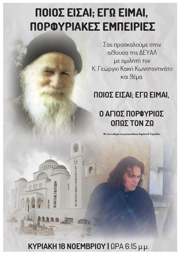 Με την ευλογία της Μητροπόλεως Λαρίσης και Τυρνάβου, η εκδήλωση φέρει τον τίτλο «Ποιος είσαι; Εγώ είμαι – Πορφυριακές Εμπειρίες» και υπόσχεται μια βιωματική προσέγγιση στη μορφή και το έργο του Αγίου Πορφυρίου, μέσα από προσωπικές μαρτυρίες και καταθέσεις ψυχής.