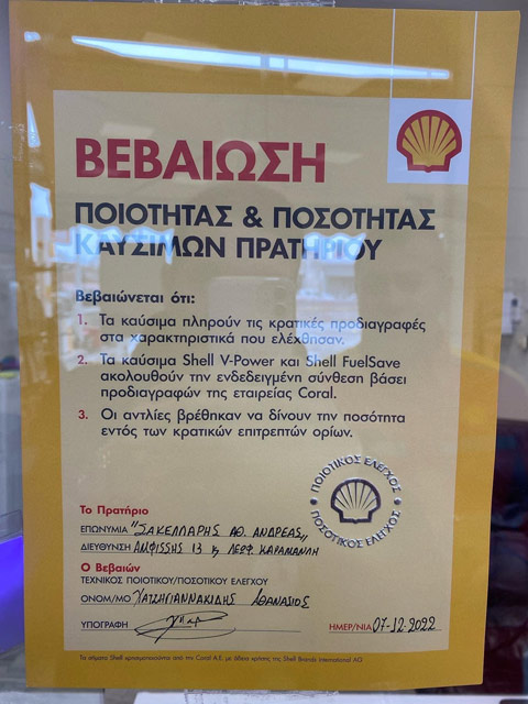 Για εκείνους η ποιότητα και η ποσότητα έχει σημασία αφού ολοκληρώσανε με επιτυχία τον αυστηρότατο έλεγχο ποιότητας και ποσότητας από εγκεκριμένο χημείο της Shell και πιστοποιήθηκε πως το πρατήριο Αθανάσιος, Νικήτας & Ανδρέας Σακελλάρης πληροί στο ακέραιο όλες τις προδιαγραφές που απαιτούνται για την καλύτερη λειτουργία του οχήματος σας!!