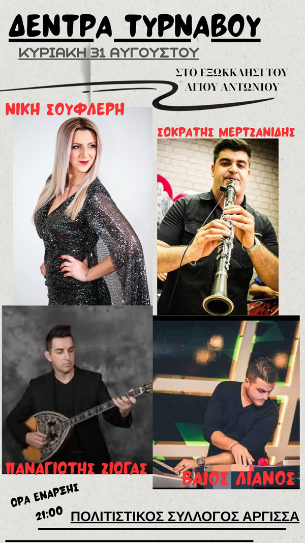 Ο Πολιτιστικός Σύλλογος Δένδρων «Η Άργισσα» ανακοινώνει το πρόγραμμα των εκδηλώσεων «Άγια Αντώνια 2025», που θα πραγματοποιηθούν με τη συνδιοργάνωση του Δήμου Τυρνάβου, συνδυάζοντας την παράδοση, τον πολιτισμό και τη θρησκευτική ευλάβεια.