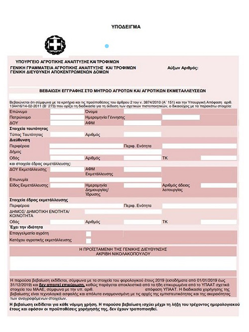 Η βεβαίωση του επαγγελματία αγρότη εκδίδεται μέσω της ψηφιακής υπηρεσίας του Μητρώου Αγροτών και Αγροτικών Εκμεταλλεύσεων (ΜΑΑΕ), η οποία είναι διαθέσιμη στον ιστότοπο του Υπουργείου Αγροτικής Ανάπτυξης και Τροφίμων, φέρει την υπογραφή της Προϊσταμένης της Γενικής Διεύθυνσης Αποκεντρωμένων Δομών και δεν χρήζει περαιτέρω επικύρωσης.