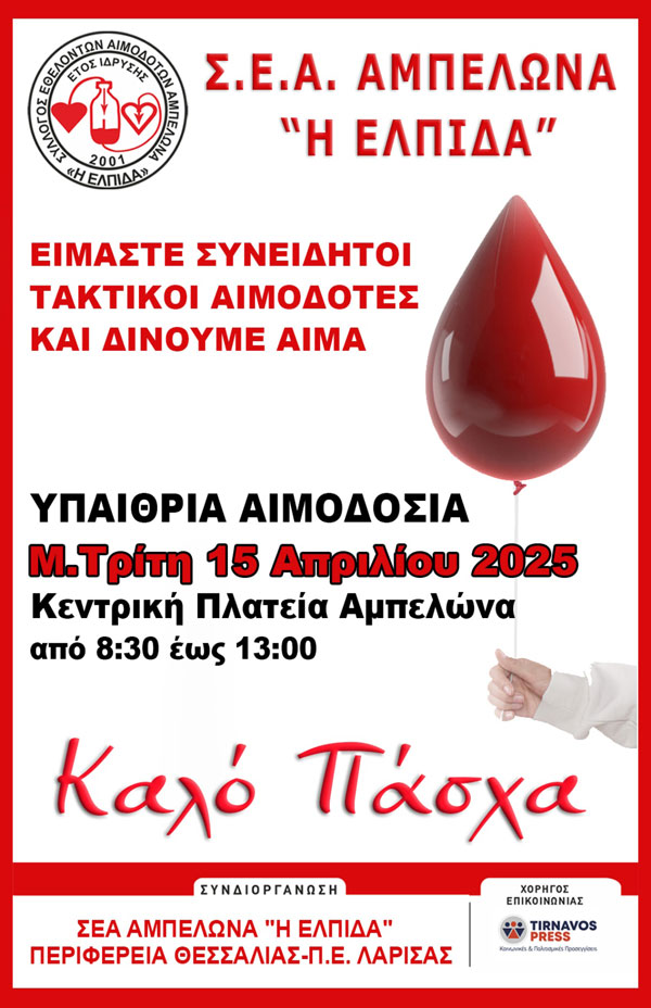 Ο Σύλλογος Εθελοντών Αιμοδοτών Αμπελώνα «Η ΕΛΠΙΔΑ», όπως κάνει χρόνια τώρα, πραγματοποιεί σε συνεργασία με την Περιφέρεια Θεσσαλίας Π.Ε. Λάρισας και την υποστήριξη του Δήμου Τυρνάβου την καθιερωμένη πλέον Εθελοντική Αιμοδοσία του για το Πάσχα τη Μεγάλη Τρίτη,  15 Απριλίου 2025, από τις 8,30 το πρωί ως τη 1:00 το μεσημέρι, σε μιά ευρύχωρη και ασφαλή Τεντοκατασκευή στην Κεντρική Πλατεία του Αμπελώνα.