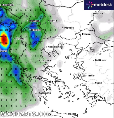 Θεσσαλία και Σποράδες: προβλέπεται αρχικά καλός καιρός αλλά από αργά το απόγευμα θα αναπτυχθούν τοπικές  νεφώσεις και θα σημειωθούν σποραδικές μπόρες στα βουνά των νομών Τρικάλων Καρδίτσας  Καλαμπάκας και Ελασσόνας και σταδιακά αργά το βράδυ πιθανώς και σε κάποιες πεδινές περιοχές του νομού Τρικάλων Καρδίτσας και Λάρισας.