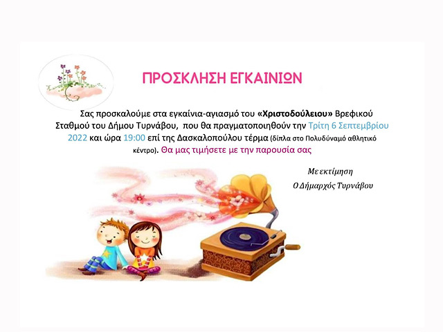 Ο Δήμαρχος Τυρνάβου Ιωάννης Κόκουρας σας προσκαλεί στα εγκαίνια – αγιασμό του Χριστοδούλειου Βρεφονηπιακού Σταθμού του Δήμου Τυρνάβου που θα πραγματοποιηθούν την Τρίτη 6 Σεπτεμβρίου 2022 και ώρα 19:00 επί της Δασκαλοπούλου τέρμα (δίπλα στο Πολυδύναμο Αθλητικό Κέντρο).