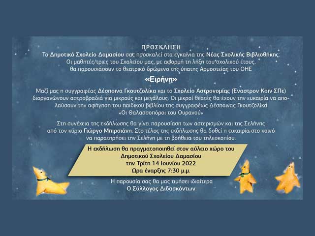 Πρόσκληση για τα εγκαίνια της σχολικής βιβλιοθήκης του Δημοτικού Σχολείου Δαμασίου