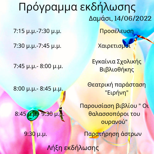 Την Τρίτη 14/06/2022 και ώρα 7:30 μ.μ., θα πραγματοποιηθούν στο Δημοτικό Σχολείο Δαμασίου, τα εγκαίνια της νέας σχολικής βιβλιοθήκης.