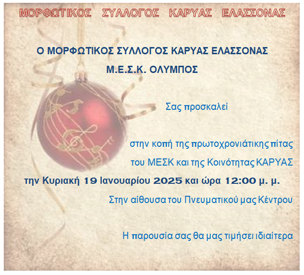 Πρόσκληση για την Κοπή της Πρωτοχρονιάτικης Πίτας του Μορφωτικού Συλλόγου Κάρυας Ελασσόνας