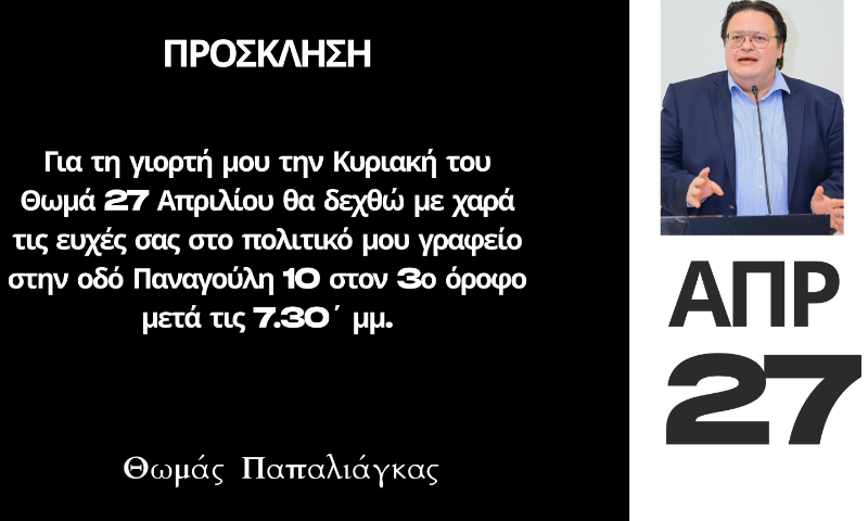 Με ιδιαίτερη χαρά, ο Θωμάς Παπαλιάγκας προσκαλεί τους φίλους και συνεργάτες του να τιμήσουν με την παρουσία τους τη γιορτή του, σε μια όμορφη συνάντηση που θα πραγματοποιηθεί την Κυριακή 27 Απριλίου μετά τις 19:30, στον χώρο του γραφείου του, οδός Παναγούλη 10, 3ος όροφος.