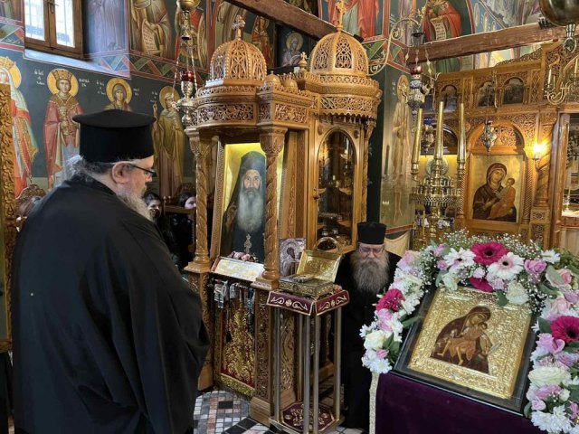Στην συνέχεια οι εκδρομείς επισκέφθηκαν την Ιερά Μονή Αγάθωνος όπου προσκύνησαν το λείψανο του Οσίου γέροντος Βησσαρίωνος. Ο Ηγούμενος της Μονής π. Γερμανός στην σύντομη προσλαλιά του αναφέρθηκε στην ιστορία της Μονής μέσα στον χρόνο και στον νέο Άγιο της Εκκλησίας μας.