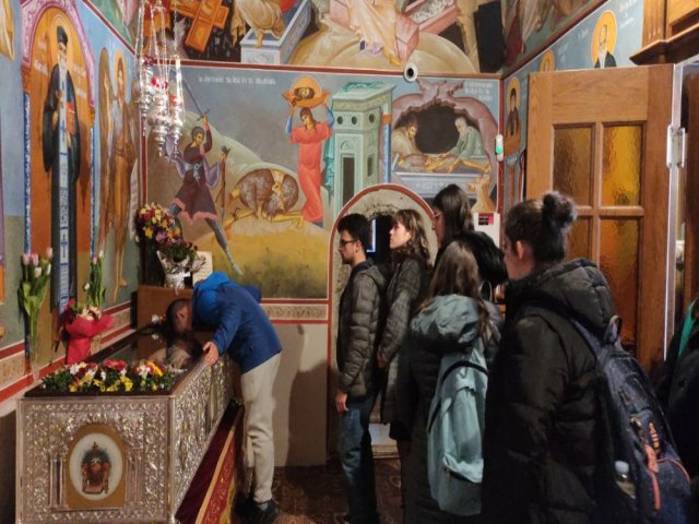 Αρχικός προορισμός ήταν η Ιερά Μονή του Οσίου Δαυίδ του εν Ευβοία όπου οι νέοι μας είχαν την δυνατότητα να ακούσουν λόγο πνευματικής οικοδομής από τον Ηγούμενο της Ιεράς Μονής π. Γαβριήλ και να προσκυνήσουν τα αγιασμένα λείψανα του Οσίου και τον τάφο του Αγίου γέροντος Ιακώβου.