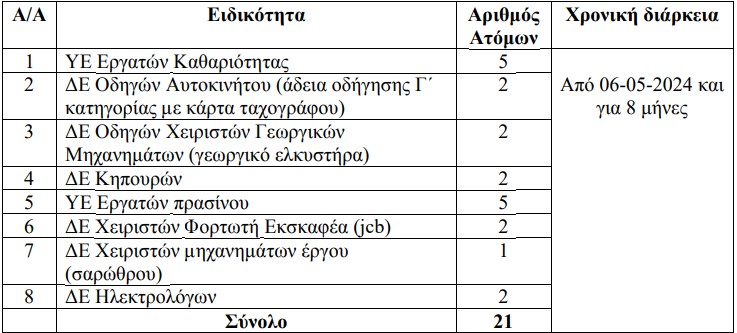 Σύμφωνα με τον αριθμό απόφασης 68/2024 ο πρόεδρος της δημοτικής επιτροπής του δήμου Τυρνάβου Στέλιος Τσικριτσής, αποφάσισε την πρόσληψη 21 ατόμων µε σχέση εργασίας Ι.∆. Ορισµένου Χρόνου για 8 μήνες.