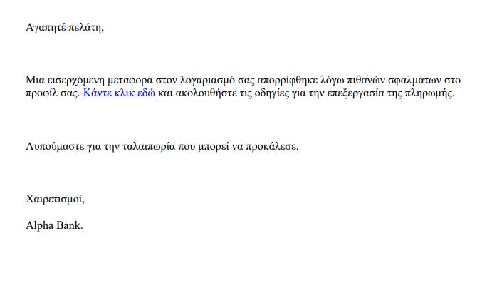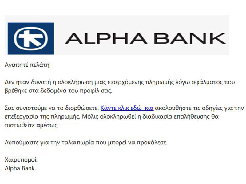 Τεράστια προσοχή πρέπει να επιδεικνύουν οι πολίτες σε μηνύματα ηλεκτρονικού ταχυδρομείου και sms στα κινητά, καθώς είναι σε έξαρση οι αποστολές παραπλανητικών μηνυμάτων από δήθεν τράπεζες, που έχουν ως στόχο την υφαρπαγή προσωπικών δεδομένων και στοιχείων τραπεζικών λογαριασμών.