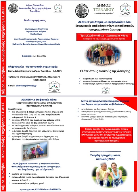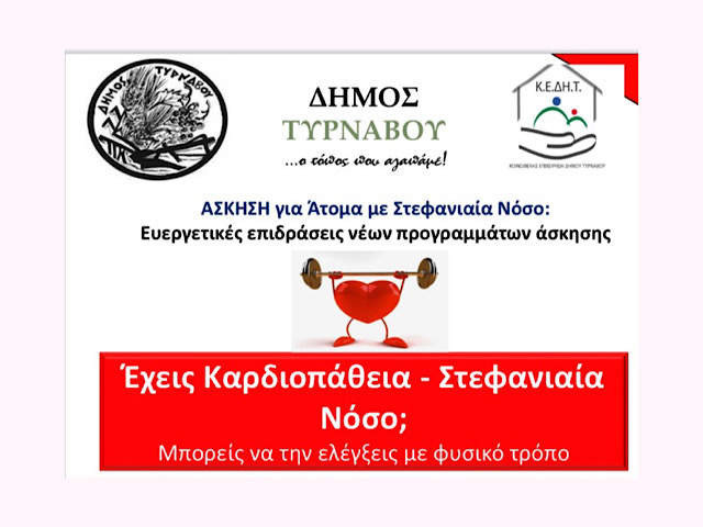 Ένα πρωτοποριακό πρόγραμμα για ασθενείς με καρδιακές παθήσεις, θα ξεκινήσει από την Κοινωφελή Επιχείρηση Δήμου Τυρνάβου (Κ.Ε.ΔΗ.Τ.) που θα είναι αφιερωμένο στην θεραπευτική άσκηση, αλλά και στην αξία της άθλησης για ασθενείς με χρόνιες παθήσεις.