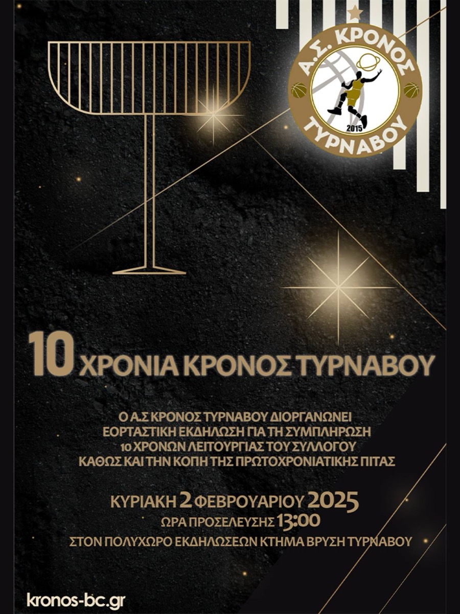Ο Α.Σ ΚΡΟΝΟΣ Τυρνάβου BC διοργανώνει εορταστική εκδήλωση για τη συμπλήρωση 10 χρόνων λειτουργίας του Συλλόγου, την Κυριακή 2 Φεβρουαρίου 2025, και ώρα 13:00, στον ΚΤΗΜΑ ΒΡΥΣΗ – Πολυχώρο Εκδηλώσεων στον Τύρναβο.