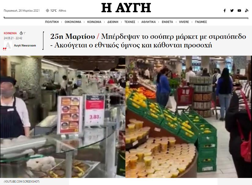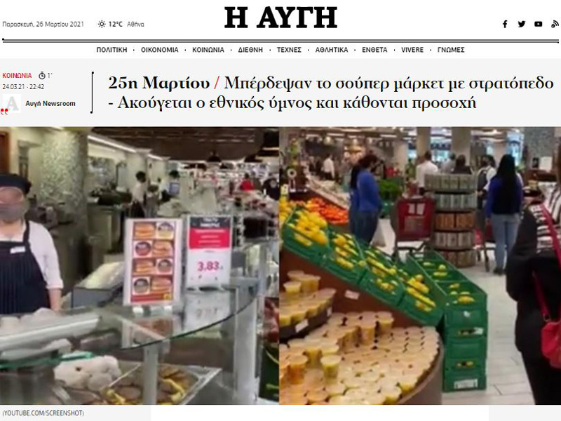 Σε άρθρο, με τίτλο “Μπέρδεψαν το σούπερ μάρκετ με στρατόπεδο – Ακούγεται ο εθνικός ύμνος και κάθονται προσοχή”, η κομματική εφημερίδα του ΣΥΡΙΖΑ γράφει: “Αίσθηση προκαλούν βίντεο που κάνει το γύρο του διαδικτύου και δείχνουν ένα ολόκληρο σούπερ μάρκετ να κάθεται προσοχή όποτε ο Εθνικός Ύμνος ακούγεται στα ηχεία του καταστήματος