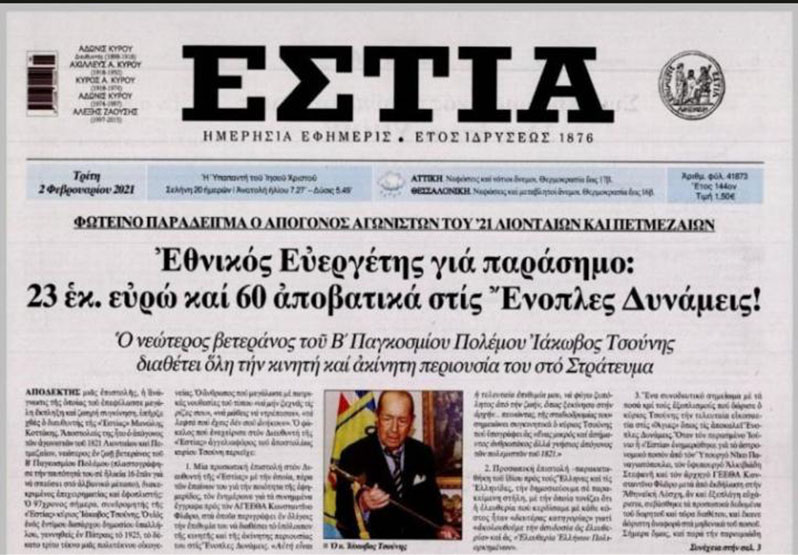Ένα τεράστιο παράδειγμα πατριωτισμού γνήσιου και άδολου πατριωτισμού προσφέρει ο 97χρονος βετεράνος του Β’ Παγκοσμίου Πολέμου, πετυχημένος επιχειρηματίας – εφοπλιστής στον πολυτάραχο βίο του, Ιάκωβος Τσούνης. Δηλώνοντας ότι επιθυμεί να φύγει από τη ζωή όπως ακριβώς ξεκίνησε, ξυπόλητος, χαρίζει την περιουσία του στις “Άγιες” όπως τις αποκαλεί, ελληνικές Ένοπλες Δυνάμεις.