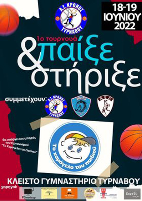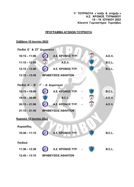 Η οικογένεια του Α.Σ. ΚΡΟΝΟΣ ΤΥΡΝΑΒΟΥ το Σαββατοκύριακο 18 – 19 Ιουνίου 2022, γιορτάζει την λήξη της φετινής χρονιάς για όλα τα τμήματα της ακαδημίας του Συλλόγου, διοργανώνοντας ένα τουρνουά – γιορτή στο Κλειστό Γυμναστήριο Τυρνάβου.