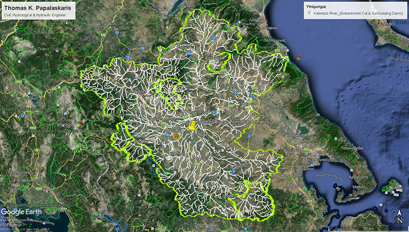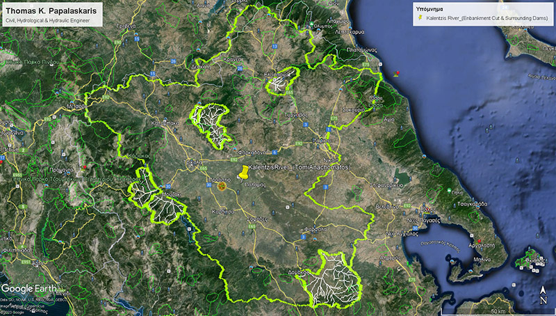 Η απεικόνιση των λεκανών απορροής, [επιφάνειες με «ανοιχτές πράσινες» αποχρώσεις, που αντιστοιχούν έως τις θέσεις όπου πρόκειται να κατασκευαστούν τα παρακάτω φράγματα: 1).το «Φράγμα Ποταμού Ενιπέα (“Σκοπιάς”) (στην θέση “Παλιοδερλί”)», (“Δήμου Φαρσάλων”), Νομού Λάρισας”» (κάτω και δεξιά, νοτιοανατολικά), 2).το «Φράγμα Ποταμού Πορταϊκού», (“Δήμου Πύλης”), Νομού Τρικάλων”» (αριστερά και επάνω, βορειοδυτικά), 3).το «Φράγμα Ποταμού Πάμισου», (“Δήμου Μουζακίου”), Νομού Καρδίτσας”» (αριστερά και κάτω, νοτιοδυτικά), 4).το «Φράγμα Ποταμού Ληθαίου», (“Δήμου Μετεώρων”), Νομού Τρικάλων”» (στο κέντρο και επάνω αριστερά, βορειοδυτικά), 5).το «Φράγμα Ποταμού Νεοχωρίτη», (“Δήμου Μετεώρων” και του “Δήμου Τρικκαίων”), Νομού Τρικάλων”» (στο κέντρο και επάνω δεξιά, βορειοανατολικά) και 6).το «Φράγμα Ποταμού Ελασσονίτη», (“Δήμου Ελασσόνας” και του “Δήμου Τυρνάβου”), Νομού Λάρισας”» (επάνω δεξιά, βορειοανατολικά) και των, (πλήρως ανεπτυγμένων), αντίστοιχων, περιεχόμενων σε αυτές, υδρογραφικών δικτύων (γραμμές με «ανοιχτή άσπρη» απόχρωση), του «Ποταμού Ενιπέα», του «Ποταμού Πορταϊκού», του «Ποταμού Πάμισου», του «Ποταμού Ληθαίου», και του «Ποταμού Νεοχωρίτη» (πλην του «Ποταμού Πηνειού» έτσι ώστε να φαίνονται καθαρά οι ακριβείς θέσεις των φραγμάτων), επί του υπόβαθρου της διαδικτυακής πλατφόρμας «Google Earth». Επίσης φαίνεται, (με την μορφή κίτρινης πινέζας), η θέση του φερόμενου σπασίματος του αναχώματος στην ευρύτερη περιοχή του «Κοσκινά Καρδίτσας». Από τα προαναφερθέντα φράγματα, τα ζεύγη (όπως έχουν παραπάνω αριθμηθεί) [(2),(3)] και [(4),(5)] συνορεύουν μεταξύ τους [1,2,3.1-3.65,4,5.1-5.2,6.1,7,8,9.1-9.2].Η απεικόνιση των λεκανών απορροής, [επιφάνειες με «ανοιχτές πράσινες» αποχρώσεις, που αντιστοιχούν έως τις θέσεις όπου πρόκειται να κατασκευαστούν τα παρακάτω φράγματα: 1).το «Φράγμα Ποταμού Ενιπέα (“Σκοπιάς”) (στην θέση “Παλιοδερλί”)», (“Δήμου Φαρσάλων”), Νομού Λάρισας”» (κάτω και δεξιά, νοτιοανατολικά), 2).το «Φράγμα Ποταμού Πορταϊκού», (“Δήμου Πύλης”), Νομού Τρικάλων”» (αριστερά και επάνω, βορειοδυτικά), 3).το «Φράγμα Ποταμού Πάμισου», (“Δήμου Μουζακίου”), Νομού Καρδίτσας”» (αριστερά και κάτω, νοτιοδυτικά), 4).το «Φράγμα Ποταμού Ληθαίου», (“Δήμου Μετεώρων”), Νομού Τρικάλων”» (στο κέντρο και επάνω αριστερά, βορειοδυτικά), 5).το «Φράγμα Ποταμού Νεοχωρίτη», (“Δήμου Μετεώρων” και του “Δήμου Τρικκαίων”), Νομού Τρικάλων”» (στο κέντρο και επάνω δεξιά, βορειοανατολικά) και 6).το «Φράγμα Ποταμού Ελασσονίτη», (“Δήμου Ελασσόνας” και του “Δήμου Τυρνάβου”), Νομού Λάρισας”» (επάνω δεξιά, βορειοανατολικά) και των, (πλήρως ανεπτυγμένων), αντίστοιχων, περιεχόμενων σε αυτές, υδρογραφικών δικτύων (γραμμές με «ανοιχτή άσπρη» απόχρωση), του «Ποταμού Ενιπέα», του «Ποταμού Πορταϊκού», του «Ποταμού Πάμισου», του «Ποταμού Ληθαίου», του «Ποταμού Νεοχωρίτη» και του «Ποταμού Πηνειού», επί του υπόβαθρου της διαδικτυακής πλατφόρμας «Google Earth». Επίσης φαίνεται, (με την μορφή κίτρινης πινέζας), η θέση του φερόμενου σπασίματος του αναχώματος στην ευρύτερη περιοχή του «Κοσκινά Καρδίτσας» [1,2,3.1-3.65,4,5.1-5.2,6.1,7,8,9.1-9.2].