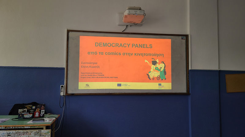 Στις 24 και 26 Μαρτίου πραγματοποιήθηκαν δύο εργαστήρια “DEMOCRACY PANELS: από τα comics στην κινητοποίηση”, με συντονίστρια την εθελόντρια Ελένη Κυρατζή από την ομάδα νέων «ΓΡΑΦΕΙΝ», στο πλαίσιο του ευρωπαϊκού έργου Erasmus+/Solidarity DEMOCRACY PANELS (2023-3-EL02-ESC30-SOL-000170264).