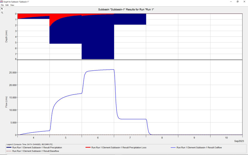 Επιπλέον, αρχικά, στην παρακάτω εικόνα απεικονίζεται το, “προσομοιωμένο ρεαλιστικό”, «ιστόγραμμα βροχόπτωσης» του χρονικού διαστήματος, “04/09-07/09/2023” (“762,40 mm”), (το οποίο και «απέδωσε» την, “προσομοιωμένη ρεαλιστική”, παροχή αιχμής νερού και συγκεκριμένα «26.151,70 κυβικά μέτρα ανά δευτερόλεπτο» ή αλλιώς «26.151,70 m3/sec»), [το οποίο και «απέδωσε», λόγω του ακραίου μετεωρολογικού φαινομένου με την κωδική ονομασία «Daniel», την, “προσομοιωμένη ρεαλιστική”, συνολική ποσότητα νερού, συγκεκριμένα, «4.152.624.900 κυβικά μέτρα (τόννους νερού)» ή αλλιώς «4.152.624.900 m3 (τόννους νερού)»], και το αντίστοιχο, “προσομοιωμένο ρεαλιστικό”, «υδρογράφημα πλημμύρας» που προκύπτει από το συγκεκριμένο, “προσομοιωμένο ρεαλιστικό”, επεισόδιο βροχόπτωσης, (λόγω του ακραίου μετεωρολογικού φαινομένου με την κωδική ονομασία «Daniel»), (η ανάλυση και οι υπολογισμοί έγιναν με το ελεύθερο στο διαδίκτυο λογισμικό «HEC-HMS» του «U.S.A. Army Corps of Engineers» δηλαδή του «Σώματος Μηχανικών του Στρατού των Η.Π.Α.») [1,2,4,5,6.1,6.2,7].