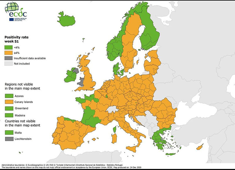 Η μέρα της γέννησης του Χριστού ξεκίνησε με μια ευχάριστη είδηση. Η Ελλάδα με πράσινο χρώμα στον χάρτη με το δείκτη θετικότητας του Covid-19 ! Ο χάρτης του European Centre for Disease Prevention and Control (ECDC), του Ευρωπαϊκού Κέντρου για τον έλεγχο και την πρόληψη της νόσου, δείχνει το ποσοστό των τεστ που βγαίνουν θετικά.