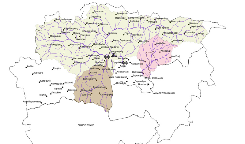 Εικόνα 1. Η απεικόνιση, της «λεκάνης απορροής» (επιφάνεια με «ανοιχτή πράσινη» απόχρωση) (του «”Πηνειού Ποταμού”, που αντιστοιχεί έως την θέση στην «Γέφυρα Διάβας», η οποία βρίσκεται περίπου στην θέση ανάμεσα στον οικισμό «Διάβα» και στην πόλη «Καλαμπάκα»), η απεικόνιση, της «λεκάνης απορροής» (επιφάνεια με «ανοιχτή καφέ» απόχρωση) (του «”Πηνειού Ποταμού” και συγκεκριμένα του «Κλεινοβίτικου Ρέματος», που αντιστοιχεί έως την θέση στην «Γέφυρα Αμπελίων», η οποία βρίσκεται περίπου στην θέση μεταξύ των οικισμών «Αμπέλια», «Μπάσια» και «Μουργκάνη»), των «υδρογραφικών (γραμμικών) δικτύων» (γραμμές με «έντονη μπλε» απόχρωση με διαβάθμιση του πάχους της γραμμής, όπου το πάχος της κάθε γραμμής εξαρτάται από την “τάξη” του εκάστοτε ρέματος που αντιπροσωπεύει δηλαδή όσο μεγαλύτερη είναι η “τάξη” του ρέματος τόσο παχύτερη είναι και η αντίστοιχη γραμμή που το αντιπροσωπεύει), η απεικόνιση, της «λεκάνης απορροής» (επιφάνεια με «ανοιχτή ροζ» απόχρωση) (του «”Πηνειού Ποταμού” και συγκεκριμένα του «Ρέματος Πότοκας», που αντιστοιχεί έως την θέση του οικισμού της «Θεόπετρας», των «υδρογραφικών (γραμμικών) δικτύων» (γραμμές με «έντονη μπλε» απόχρωση με διαβάθμιση του πάχους της γραμμής, όπου το πάχος της κάθε γραμμής εξαρτάται από την “τάξη” του εκάστοτε ρέματος που αντιπροσωπεύει δηλαδή όσο μεγαλύτερη είναι η “τάξη” του ρέματος τόσο παχύτερη είναι και η αντίστοιχη γραμμή που το αντιπροσωπεύει),των «οικισμών του Δήμου Μετεώρων» (κουκίδες με «μαύρη» απόχρωση και ονομασία, επίσης, με «μαύρη» απόχρωση), του «περιγράμματος του “Δήμου Μετεώρων”» (γραμμή με «μαύρη» απόχρωση) και η προτεινόμενη θέση ενός «νέου φράγματος, (σχετικό εικονίδιο)», «του οποίου η ενδεχόμενη κατασκευή θα μείωνε την υδραυλική πίεση» στην «Γέφυρα Διάβας» κατά περίπου «95%» όπως απεικονίζονται στο «ελεύθερο διαδικτυακά λογισμικό» «Q.G.I.S.» [4], μέσω των σχετικών αρχείων που ανακτήθηκαν τόσο από την σχετική διαδικτυακή «πλατφόρμα» («Copernicus») όσο και από την σχετική διαδικτυακή «πλατφόρμα» («ΕΛ.ΣΤΑΤ.»),[1,2,4].