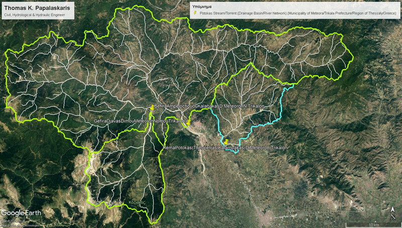 Εικόνα 3. Η απεικόνιση 1).της λεκάνης απορροής, [μεγάλη επιφάνεια με περίγραμμα με «ανοιχτή πράσινη» απόχρωση, που αντιστοιχεί έως την θέση όπου έχει κατασκευαστεί η «Γέφυρα Διάβας”», (“Δήμου Μετεώρων”), Νομού Τρικάλων”»] και του (πλήρως ανεπτυγμένου) αντίστοιχου, περιεχόμενου σε αυτήν, υδρογραφικού δικτύου (γραμμές με «άσπρη» απόχρωση), του «Πηνειού Ποταμού», 2).της λεκάνης απορροής, [μικρή επιφάνεια με περίγραμμα με, επίσης, «ανοιχτή πράσινη» απόχρωση, που αντιστοιχεί έως την θέση όπου έχει κατασκευαστεί η «Γέφυρα Αμπελίων”», (“Δήμου Μετεώρων”), Νομού Τρικάλων”»] και του (πλήρως ανεπτυγμένου) αντίστοιχου, περιεχόμενου σε αυτήν, υδρογραφικού δικτύου (γραμμές με «άσπρη» απόχρωση), του «Ποταμού Πηνειού» (και συγκεκριμένα του «Κλεινοβίτικου Ρέματος», το οποίο αποτελεί παραπόταμο του «Πηνειού Ποταμού») και 3).της λεκάνης απορροής, [μικρή επιφάνεια με περίγραμμα με, «θαλασσί πράσινη» απόχρωση, που αντιστοιχεί έως την θέση όπου βρίσκεται ο οικισμός της «Θεόπετρας”», (“Δήμου Μετεώρων”), Νομού Τρικάλων”»] και του (πλήρως ανεπτυγμένου) αντίστοιχου, περιεχόμενου σε αυτήν, υδρογραφικού δικτύου (γραμμές με «άσπρη» απόχρωση), του «Ποταμού Πηνειού» (και συγκεκριμένα του «Ρέματος Πότοκας», το οποίο αποτελεί παραπόταμο του «Πηνειού Ποταμού»), επί του υπόβαθρου της διαδικτυακής πλατφόρμας «Google Earth» [1,2,4,10].