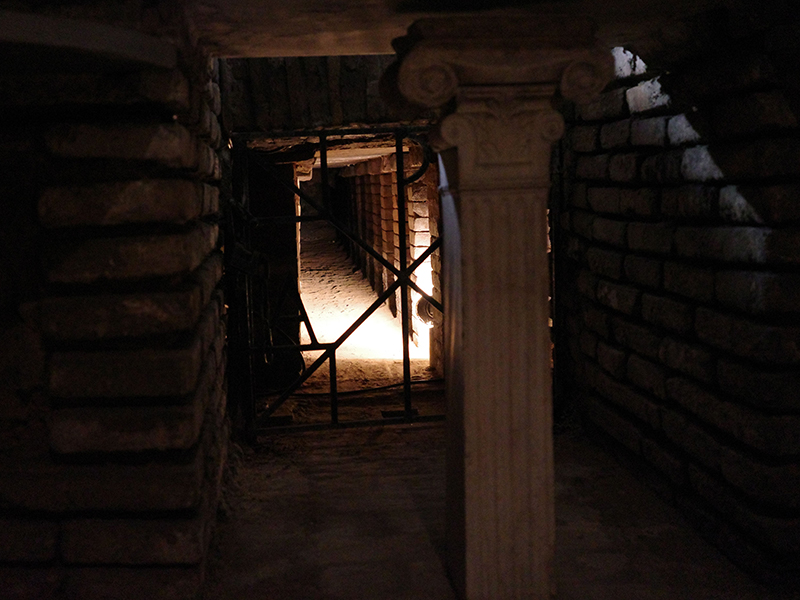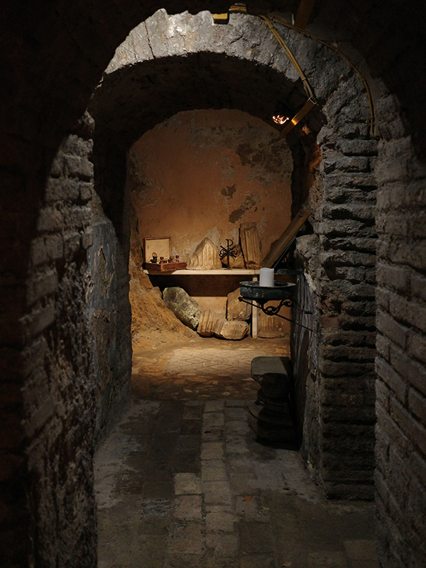 Κατεβαίνοντας μέσα από ένα στενό πέρασμα, ο επισκέπτης βυθίζεται σ’ έναν σκοτεινό κόσμο γεμάτο πέτρα, υγρασία και μνήμη. Εκεί κάτω βρίσκονται οι θολωτές υποδομές των ρωμαϊκών λουτρών — ένας λαβύρινθος από καμαρωτές κατασκευές, σωλήνες και πλινθοδομές που κάποτε μετέφεραν θερμό αέρα, νερό και φως.