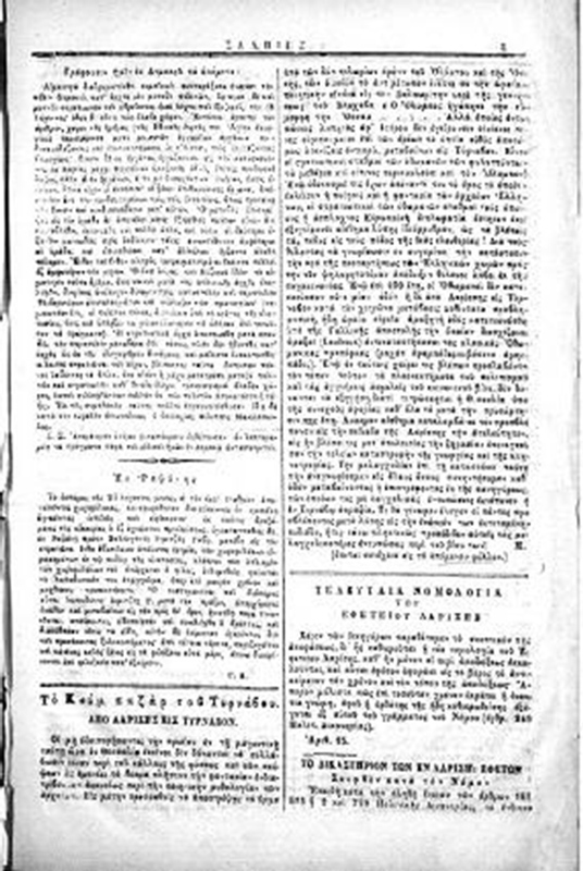 Εἶναι οἱ στρατιωτικοί σταθμοί τῶν Ὀθωμανῶν τῶν φυλαττόντων τά μεθόρια καί οἵτινες περικυκλοῦσι καί τόν Ὄλυμπον. Ἐνῷ ὁδοιπόρει τις ἔχων ἀπέναντί του τό ὄρος τό ὁποῖον ἐκλέισεν ἡ ποίησις καί ἡ φαντασία τῶν ἀρχαίων Ἑλλήνων, οἱ στρατιωτικοί τῶν Ὀθωμανῶν σταθμοί τούς ὁποίους ἡ ἄσπλαχνος Εὐρωπαϊκή διπλωματία ἔστησεν ἐκεῖ ἐξεγείρουσιν αἴσθημα λύπης ἰδιόρρυθμον, ὡς νά βλέπεις τούς πέδας εἰς τούς πόδας τῆς θεᾶς ἐλευθερίας! Διά τούς θέλοντας νά γνωρίσωσιν ἐν συγκρίσει τήν κατάστασιν τήν πρό τῆς προσαρτήσεως τῶν Ἑλληνικῶν χωρῶν πρός τήν νῦν ψηλαφητοτέραν ἀπόδειξιν θέλουσι λάβει ἐκ τῆς συγκοινωνίας. Ἐνῷ ἐπί 400 ἔτη, οἱ Ὀθωμανοί δέν κατεσκεύασαν οὔτε μίαν  ὁδόν, ἡ δέ ἀπό Λαρίσης εἰς Τυρναβον κατά τόν χειμῶνα μετάβασις καθίστατο προβληματική, ἤδη ὡραία εὐρεῖα ἁμαξητή ὁδός κατεσκευάσθη ὑπό τῆς γαλλικῆς ἀποστολῆς τήν ὁποία διασχιζουσι ἅμαξαι (Landeaux) ἀντικαταστήσασαι τάς κλασικάς ὀθωμανικάς πρασόφκας (ραχάτ ἀραμπάδες =βάσανο ἀραμπάδες), ἐνῷ ἐν τούτοις χαίρει τις προσλαμβάνοντα τόν τόπον τοῦτον τά πλεονεκτήματα τοῦ πολιτισμοῦ καί τάς ἐγγυήσεις ἀσφαλεῖς τοῦ κοινωνικοῦ βίου, δέν δύνανται νά ἐξηγήσῃ διατί τιτρώσκεται ἡ Θεσσαλία ὑπό τῆς συνεχοῦς ἀφορίας καθ’ ὅλα τά μετά τήν προσάρτησίν της ἔτη. Λυπηρόν  αἴσθημα καταλαμβάνει τόν προσβλέποντα εἰς τήν πεδιάδα τῆς Λαρίσης τήν ἀτελεύτητον, εἰς ἥν βλέπει τις μετ’ ἀπελπισίας τήν ξηρασίαν ἐπενεγκοῦσαν τήν τέλειαν καταστροφήν τῆς γεωργίας καί τῆς κτηνοτροφίας. Τήν μελαγχολίαν ἐπί τῇ καταστάσει ταύτῃ τήν ἀνεγνωρίσαμεν εἰς ὅλους ὅσους συνηντήσαμεν καθ’ οδον  μεταβαίνοντας ἤ ἐπιστρέφοντας ἐκ τῆς πανηγύρεως, τῶν ὁποίων τάς μελαγχολικάς ἐντυπώσεις ἐκράτυνεν ἡ ἐν Τυρνάβῳ ἀπραξία. Τί θά γίνωμεν ἔλεγον οἱ πάντες προσβλέποντες μετά λύπης εἰς τήν ἐνώπιόν των ἐκτεταμένην πεδιάδα, ἥτις τόσο πληκτικῶς προσέδιδεν αὐτοῖς τάς μελαγχολικοτέρας ἐντυπώσεις περί τοῦ βίου των.